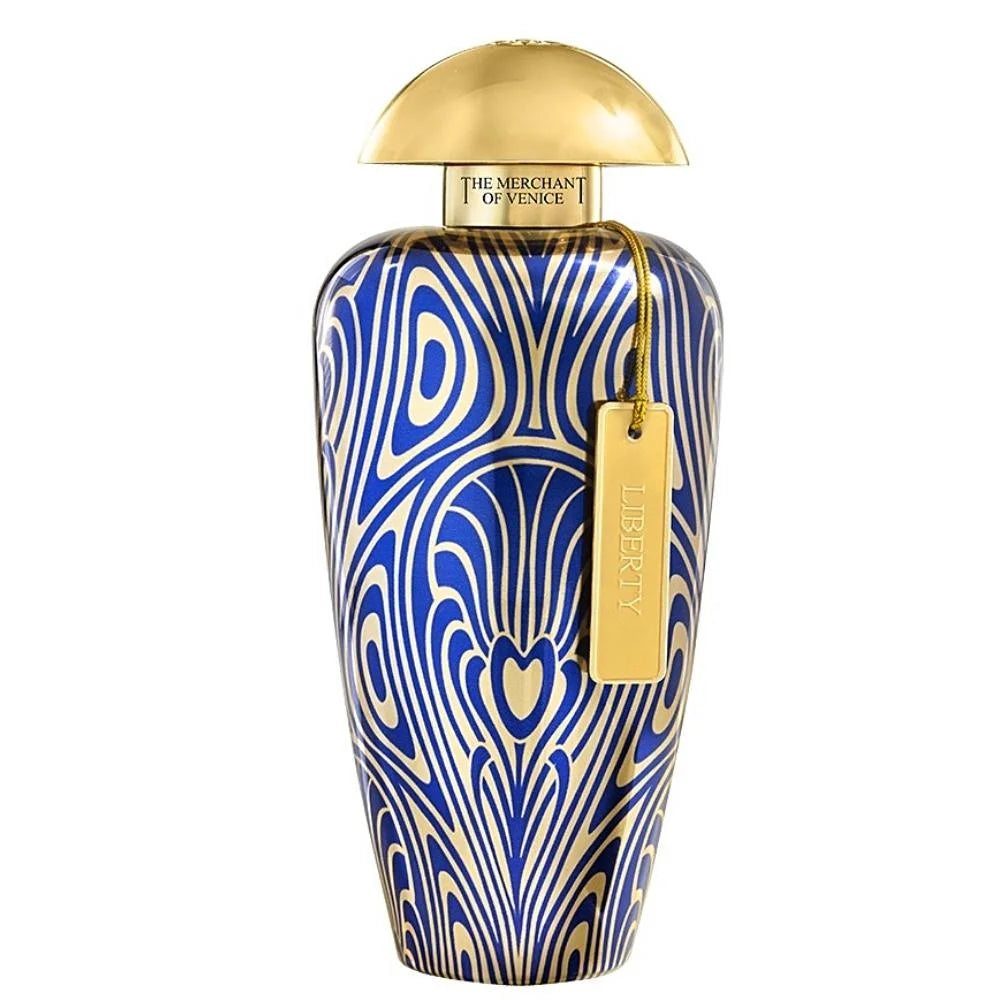 El perfume Liberty está encerrado en un elegante frasco hecho en los típicos colores venecianos azules y dorados. Reinterpreta la forma más clásica del diseño de cristal de Murano que muestra un motivo particular. No es raro encontrar hermosas telas de tapicería, hechas con materiales preciosos e impresas con colores vibrantes y profundos. Este frasco inusual se inspira en estas telas y transmite una impresión de ensueño con un diseño ligero que fluye por toda su superficie.