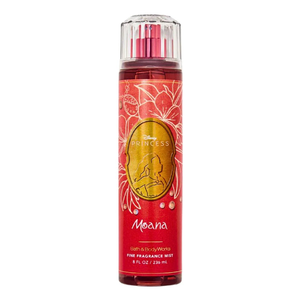 El body mist de 236 ml de Bath & Body Works, inspirado en la princesa Moana, presenta una fragancia con notas de palmas verdes exuberantes, brisa de plumeria y agua de coco. Esta combinación ofrece un aroma que equilibra lo afrutado y lo floral, con un toque de coco, evocando la esencia aventurera y valiente de Moana.