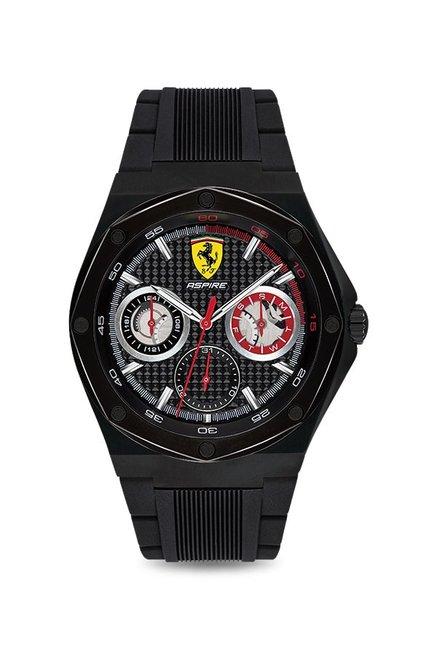 Establezca sus parámetros de moda con este reloj analógico para hombres de la colección Aspire de Ferrari. La esfera redonda negra muestra tres manos simples, marcas de palillos y números a intervalos de cinco minutos, tres subesferas, un logotipo de la marca en la posición de la hora 12 y una corona para ajustar el tiempo.