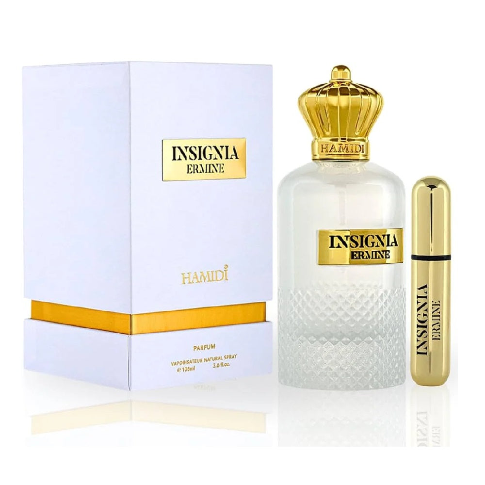 Insignia Ermine de Hamidi es una fragancia de la familia olfativa para Hombres y Mujeres. Esta fragrancia es nueva. Insignia Ermine se lanzó en 2023. Las Notas de Salida son naranja tangerina, ruibarbo y lichi; las Notas de Corazón son Acuerdo goloso, frutas tropicales, peonía y rosa; las Notas de Fondo son cachemira, vainilla, almizcle y sándalo.