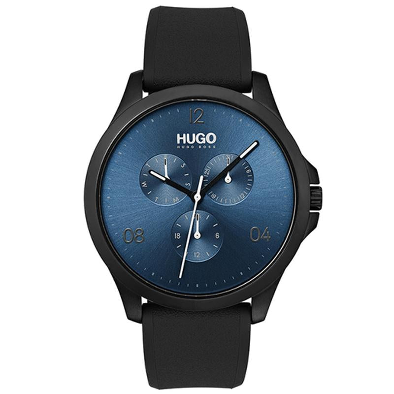 Reloj casual multifuncional negro de acero inoxidable de 41mm, redondo. Dial azul y pulsera de silicona negro. 3 atm