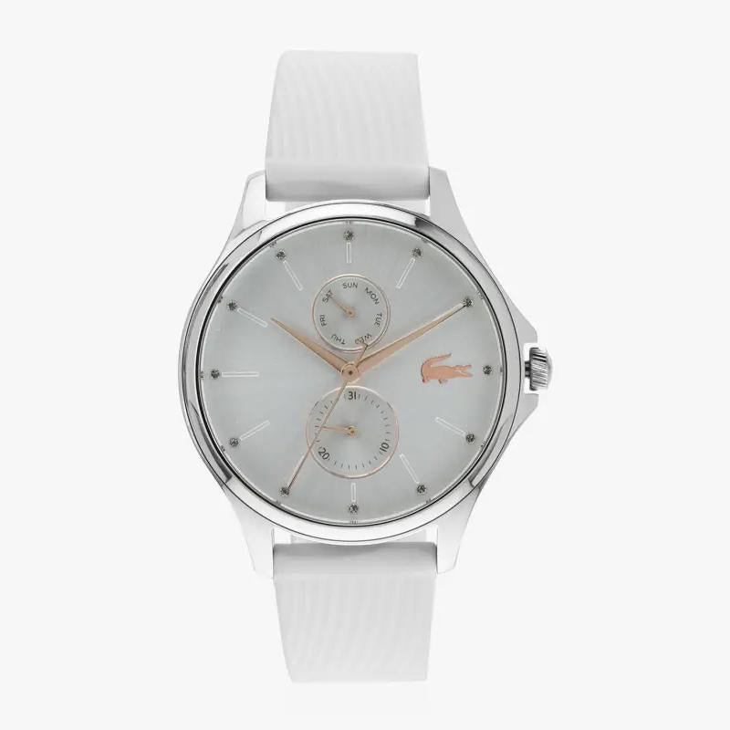 Tres manecillas. Esfera negra decorada con cristales Swarovski. Correa de silicona negra. 3 cajeros automáticos de resistencia al agua.
