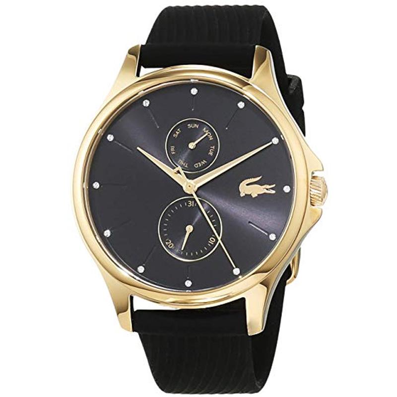 Tres manecillas. Esfera negra decorada con cristales Swarovski. Correa de silicona blanca. 3 cajeros automáticos de resistencia al agua.