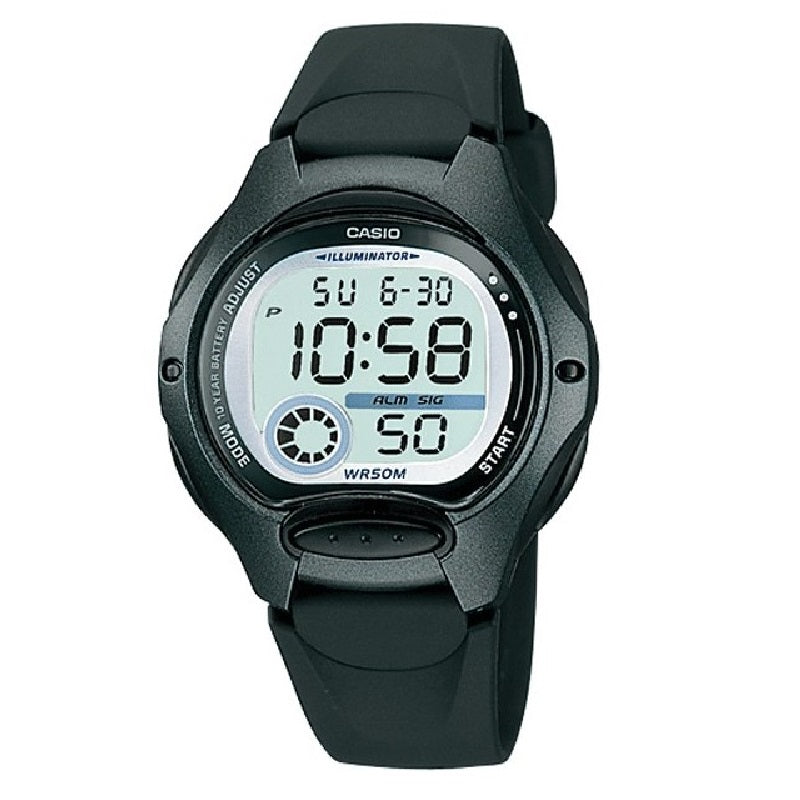Caja de resina negra con correa de resina negra. Bisel fijo de raso negro. Esfera digital que muestra: horas, minutos, segundos, am/pm, fecha y día de la semana. Tipo de esfera: digital. Calendario perpetuo. Movimiento de cuarzo Casio calibre 2672. Cristal mineral resistente a los arañazos. Fondo de caja sólido. Dimensiones de la caja: 37,9 mm x 34,9 mm, grosor de la caja: 11,9 mm. Forma de caja redonda. Ancho de banda: 17 mm. Cierre de espiga. Resistente al agua a 50 metros/165 pies. Funciones: fecha, día, hora, minuto, segundo, cronómetro, alarma