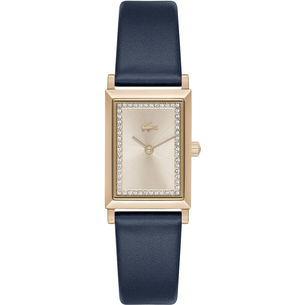 Reloj Lacoste para mujer de la colección Catherine. Con una caja IP rectangular ultradelgada de oro clavel de 28 mm con cristales pavimentados en una esfera con rayos de sol. Acabado con una correa de piel lisa de color azul marino. Resistente al agua hasta 3ATM.