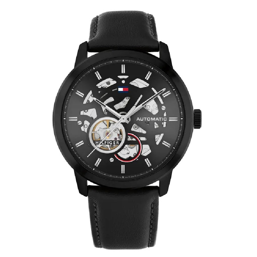 El Tommy Hilfiger Henry Automático 1710659 es un reloj automático elegante y moderno con fondo transparente y esfera esqueletizada que permite controlar el movimiento. La caja de acero inoxidable mide 43 mm de ancho y 12,15 mm de grosor. La correa negra de cuero genuino tiene un ancho de 22 mm en el punto de enganche y una longitud de 160 a 210 mm. La esfera negra con agujas e índices plateados está protegida por cristal mineral. El Tommy Hilfiger Henry Automático 1710659 tiene una resistencia al agua de 50 m/5 atm, lo que significa que tiene una resistencia limitada (no se recomienda nadar).