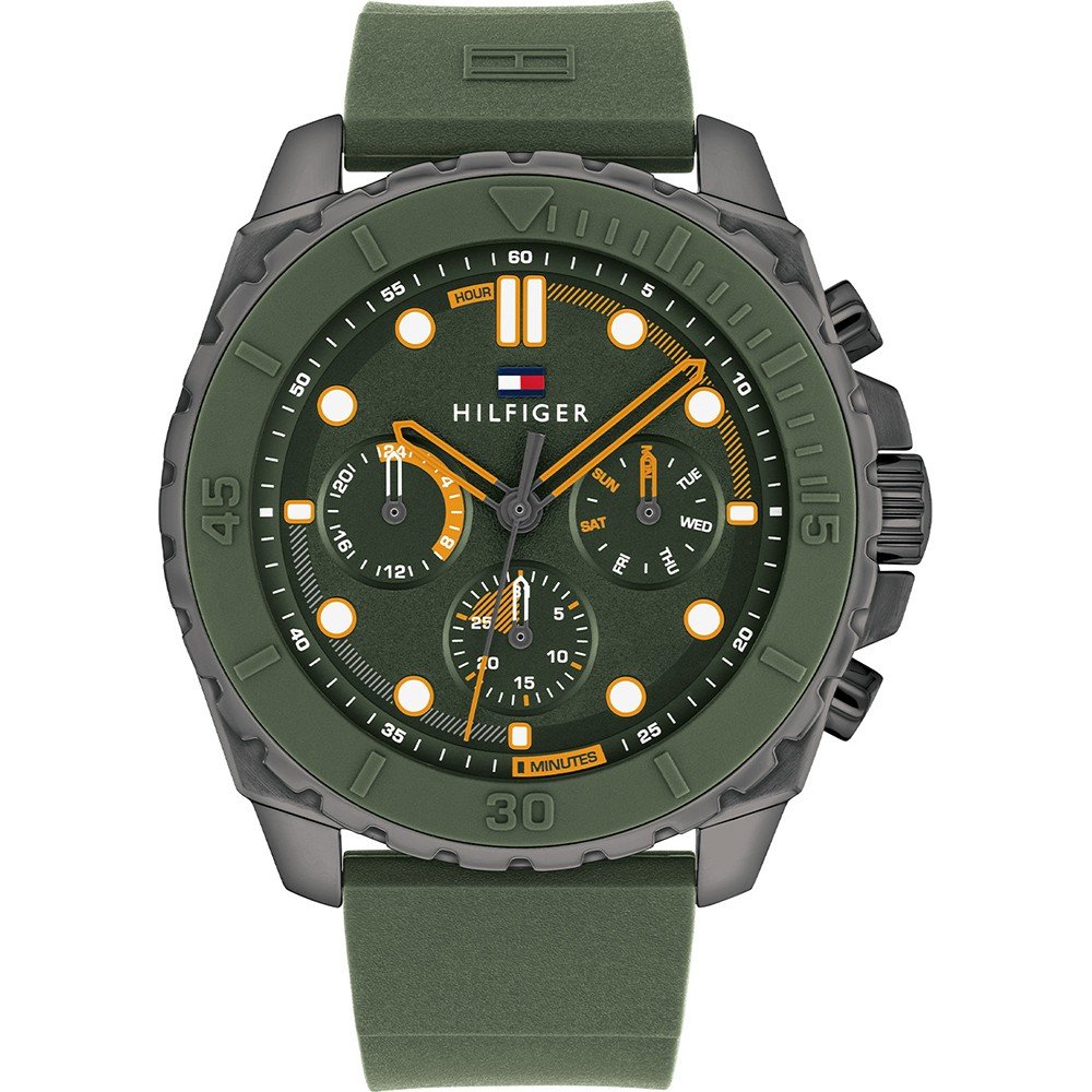 Este reloj Tommy Hilfiger tiene una caja de acero inoxidable de 48 mm de diámetro y correa de caucho. En su interior se encuentra un movimiento Seiko Instruments Inc. y el reloj cuenta con un cristal mineral.