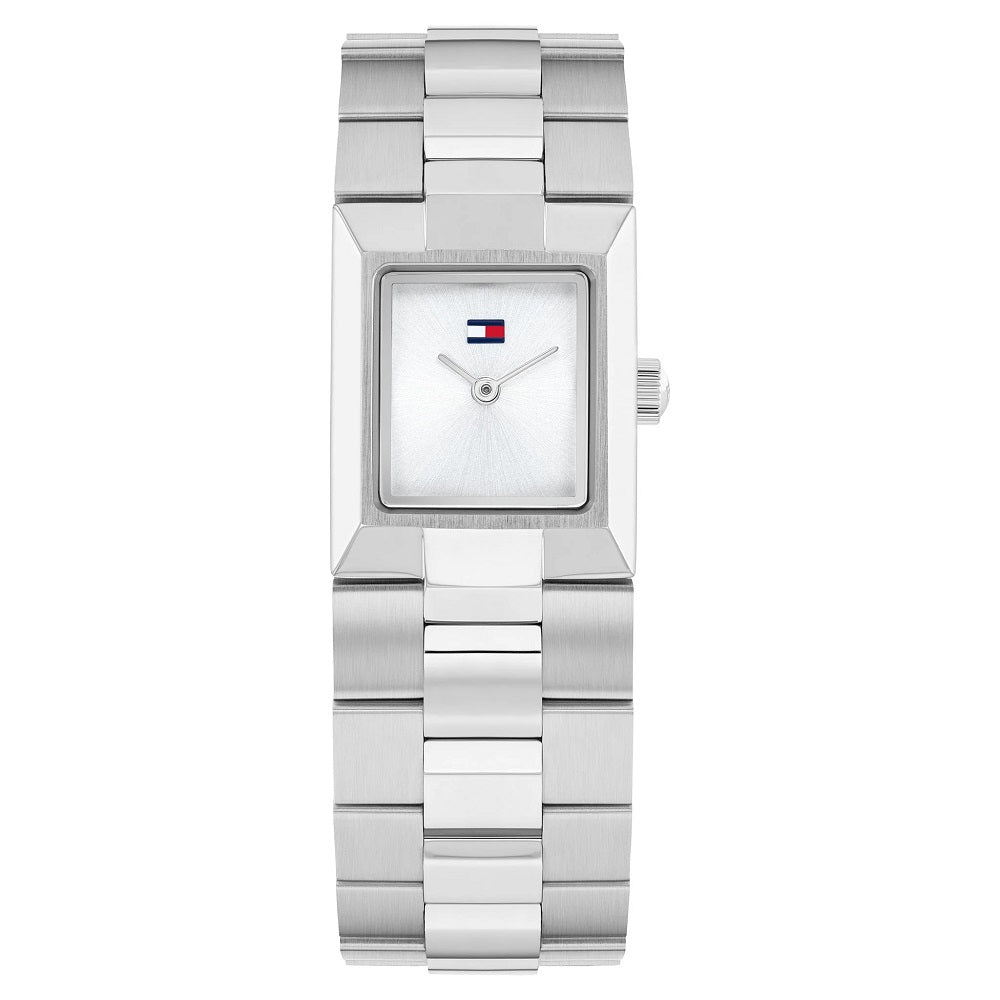 El Reloj Tommy Hilfiger Ivy 1782786 es un accesorio femenino de cuarzo, caracterizado por su diseño elegante y moderno con caja rectangular de acero inoxidable plateado (aprox. 20-25 mm) y esfera a juego. Destaca por su brazalete de eslabones macizos, cierre desplegable, resistencia al agua de 3 ATM y la icónica bandera de la marca a las 12.
