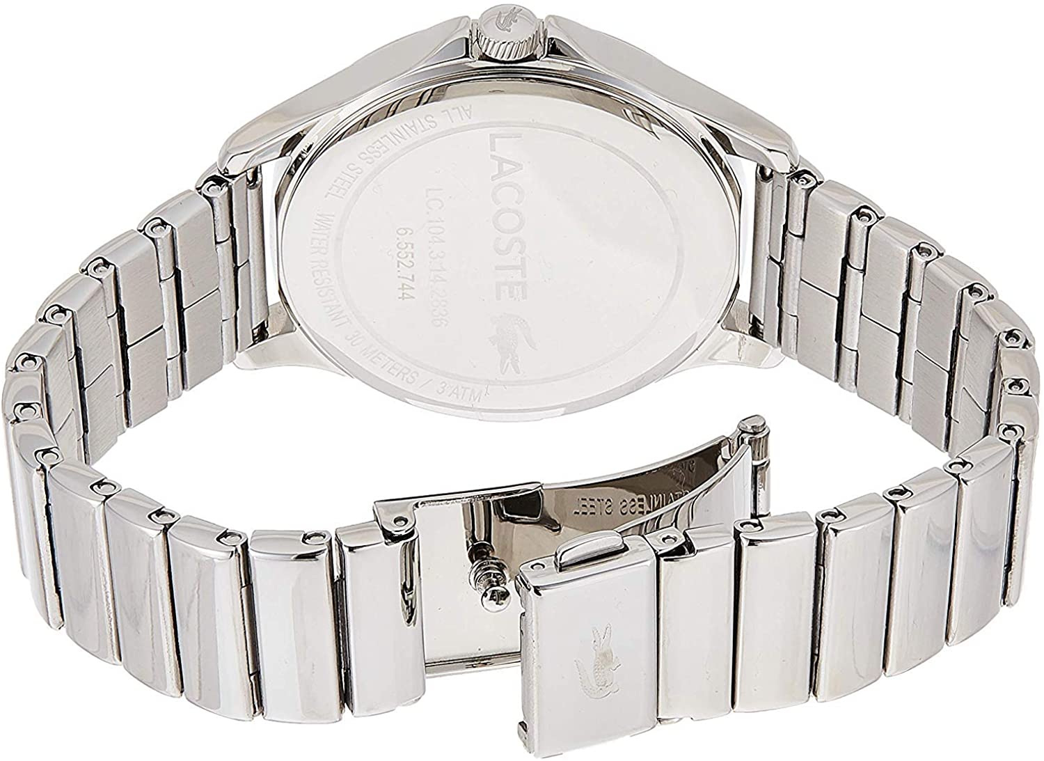 Este es el reloj Lacoste Kea Se presenta con una caja de acero inoxidable de 38 mm montada sobre una pulsera de acero inoxidable a juego.